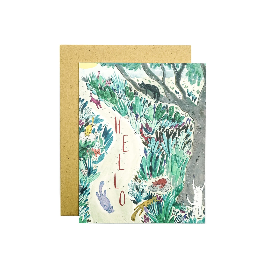 “Hello” is a print of an original watercolor artwork depicting cats on a walk giving all sorts of greetings. Give a hello to a friend, coworker, family or loved one.