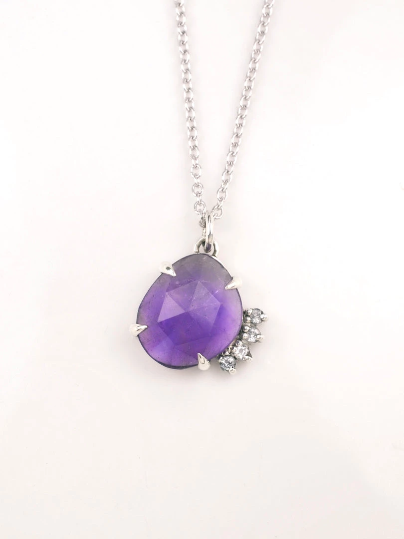 A deep purple, freeform amethyst accented with a sparkling half halo. A cheerful, bright pop of color in an asymmetrical style. Natural, untreated stones.