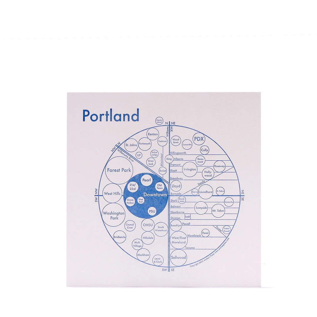 This describes the central skeleton of the city, along with the neighborhoods that have grown out of it. The original sketch came from a question many visitors and recent immigrants ask: “What’s North Portland?”. The longer Archie lived here, the more it grew to include as many neighborhoods as possible.