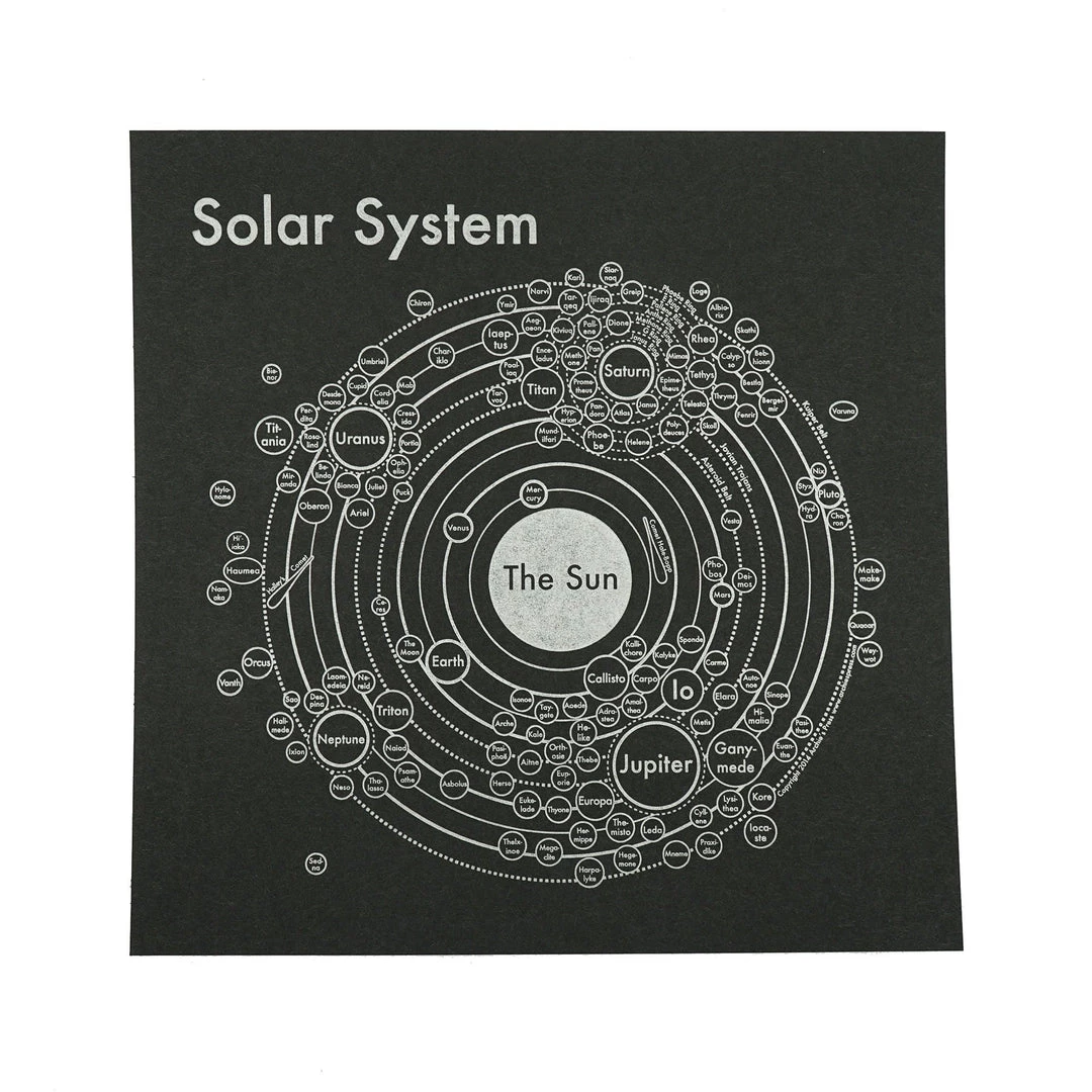 The Solar System is a very abstract concept for us humans. We “know” that there are planets and moons, but we really don’t have a “true” conception of that scale. Therefore, Archie created this map to package all the information in a digestible way.