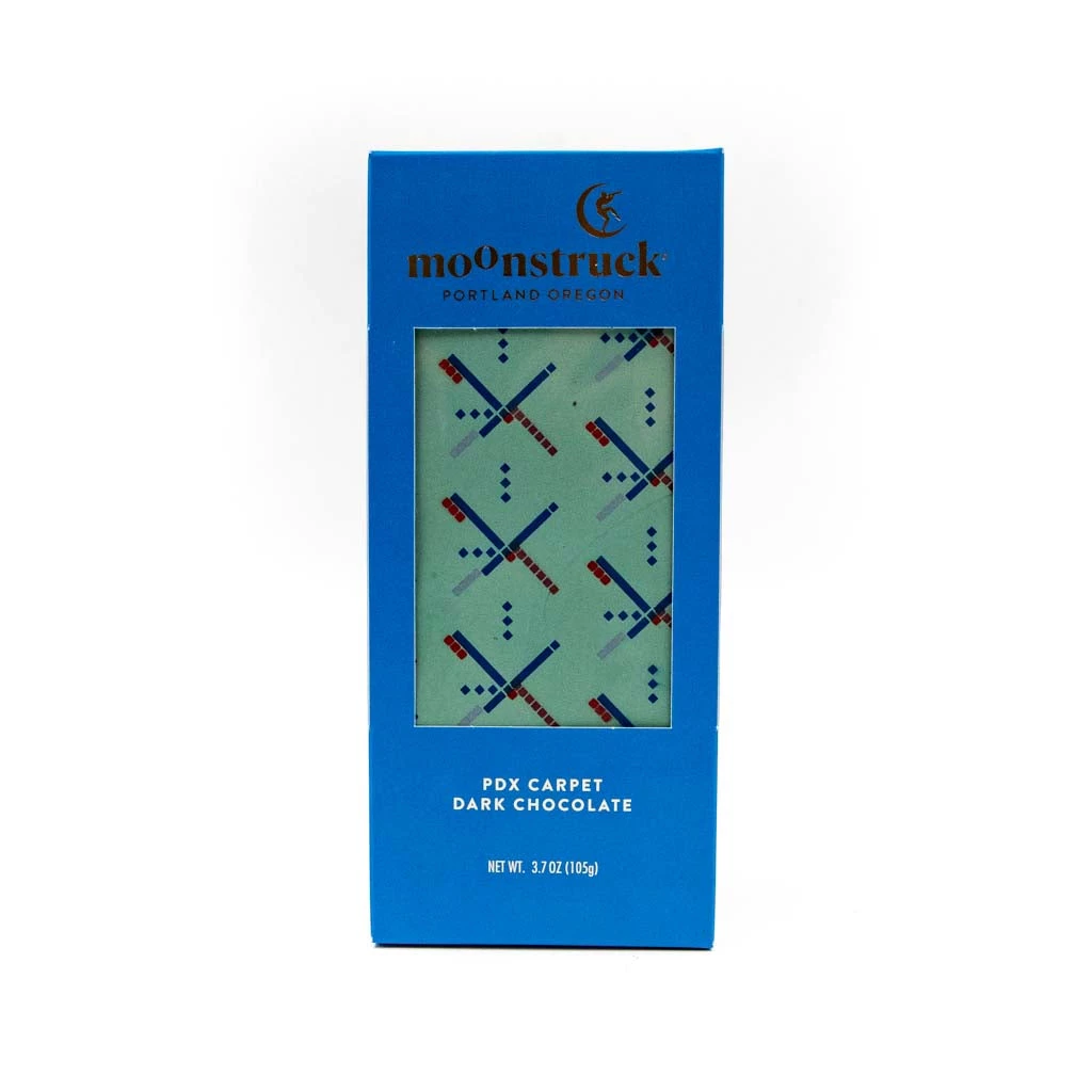 Rich dark chocolate with the famous PDX airport carpet design by Moonstruck Chocolate Co.