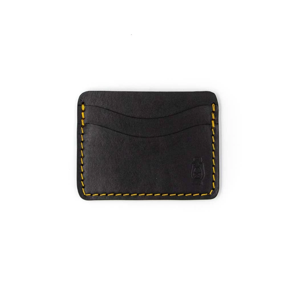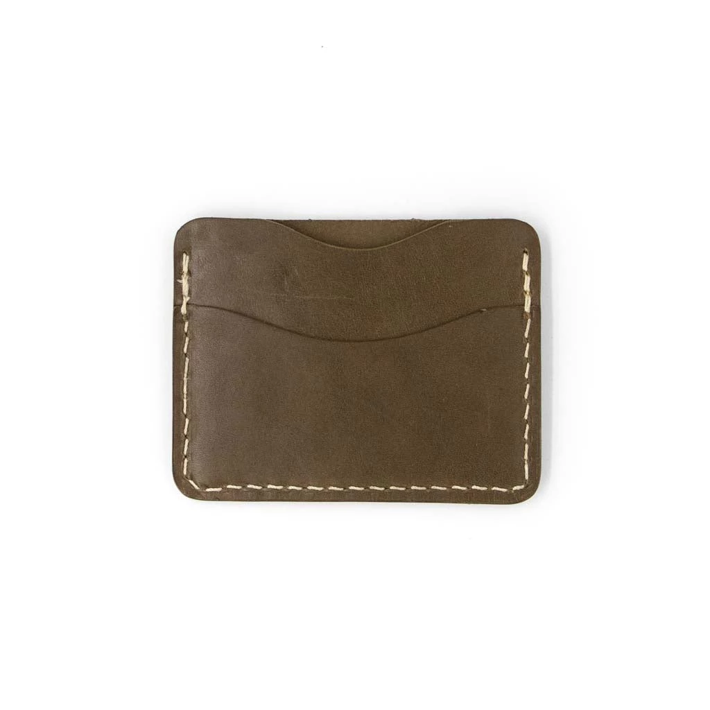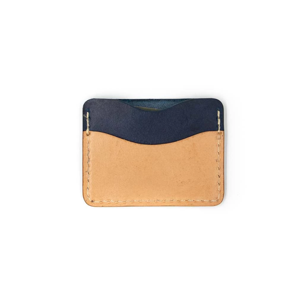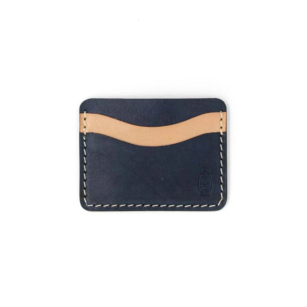 A wallet great for your front pocket. It has 3 card slots, 1 center pocket for folded cash or additional cards. Each slot can fit up to 2-3 cards. Hand-stitched with durable American-made waxed polycord and built to last.
