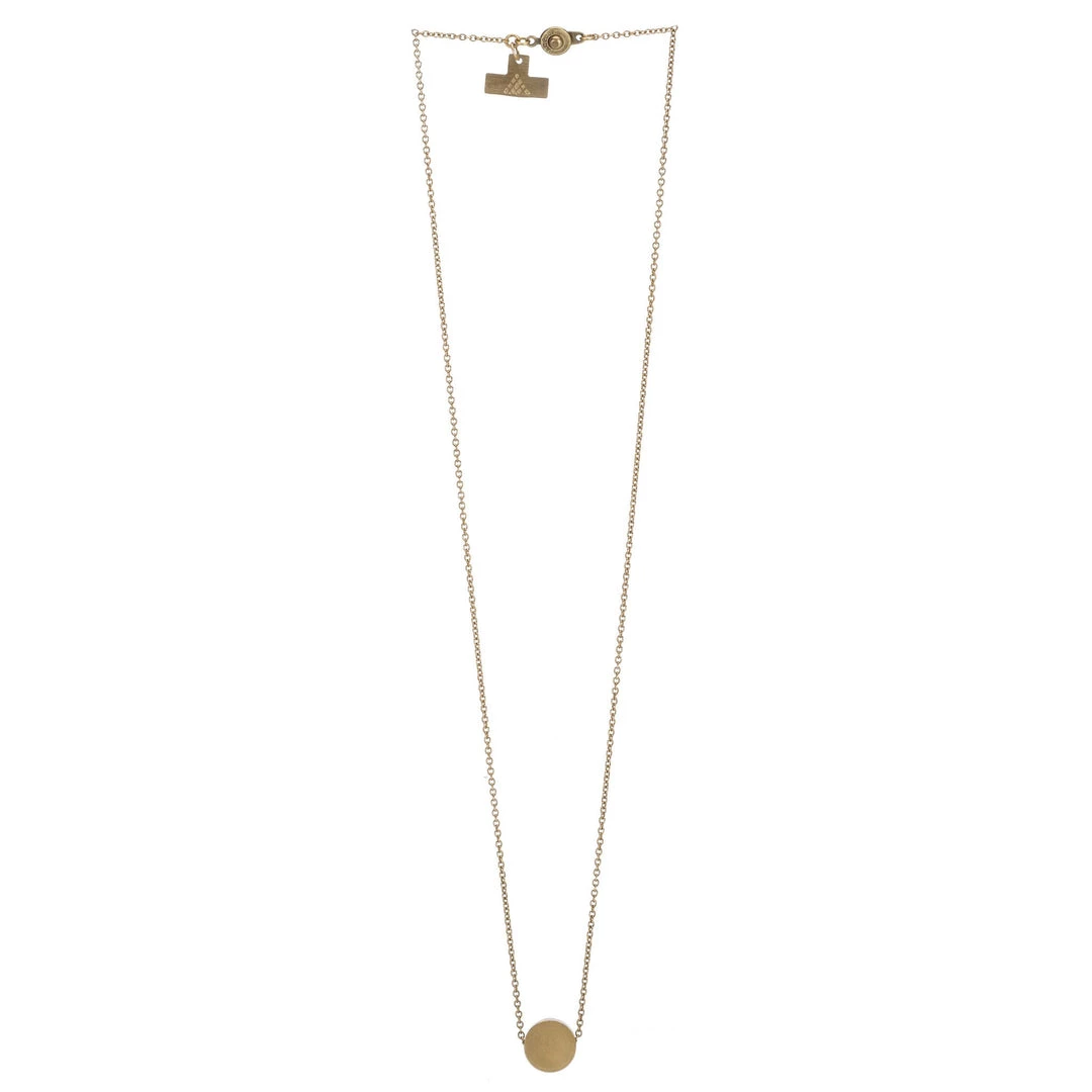 Fine brass chain necklace with floating disc pendant.