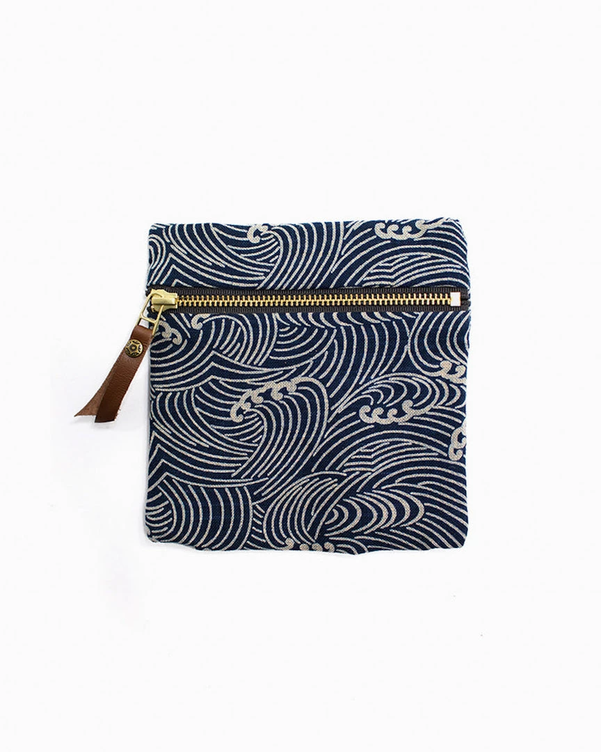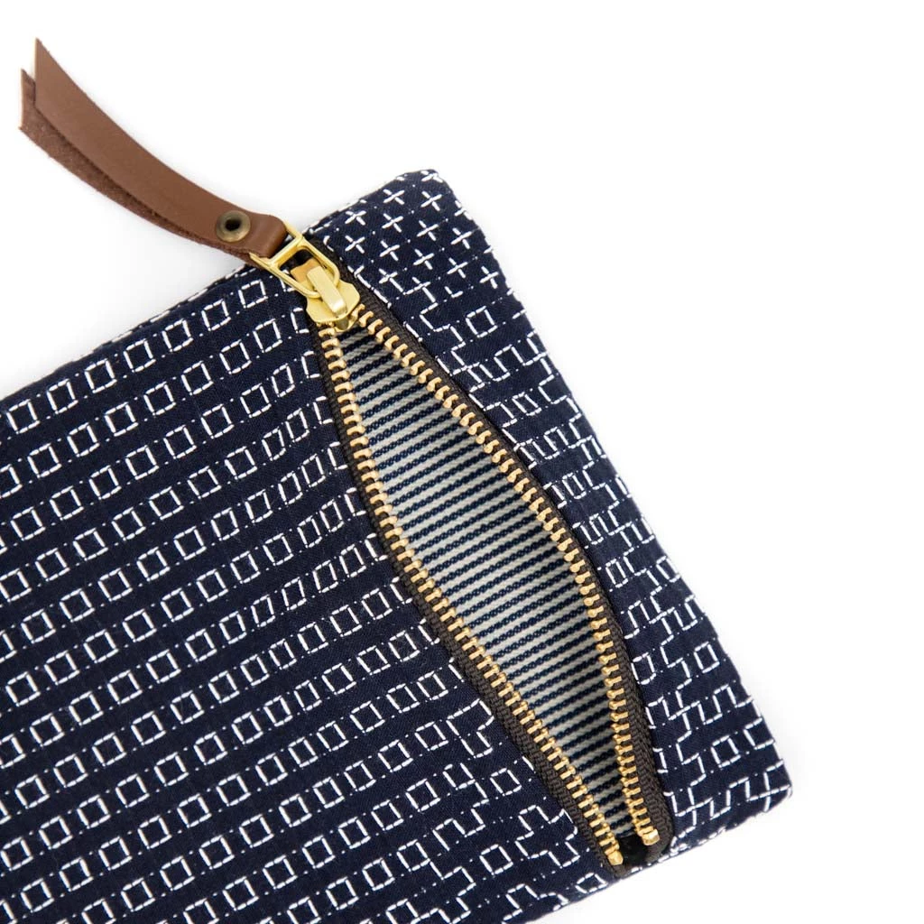 This particular zipper pouches are made with Sashiko Fabrics from Miwa Orimono, which is the only company in Japan that has kept this special jacquard machine from the 1940s. These machines are so intricate and old, one machine stitches only 1 meter of fabrics in an hour. These pouches were strengthened with stitches to reinforce points of wear.