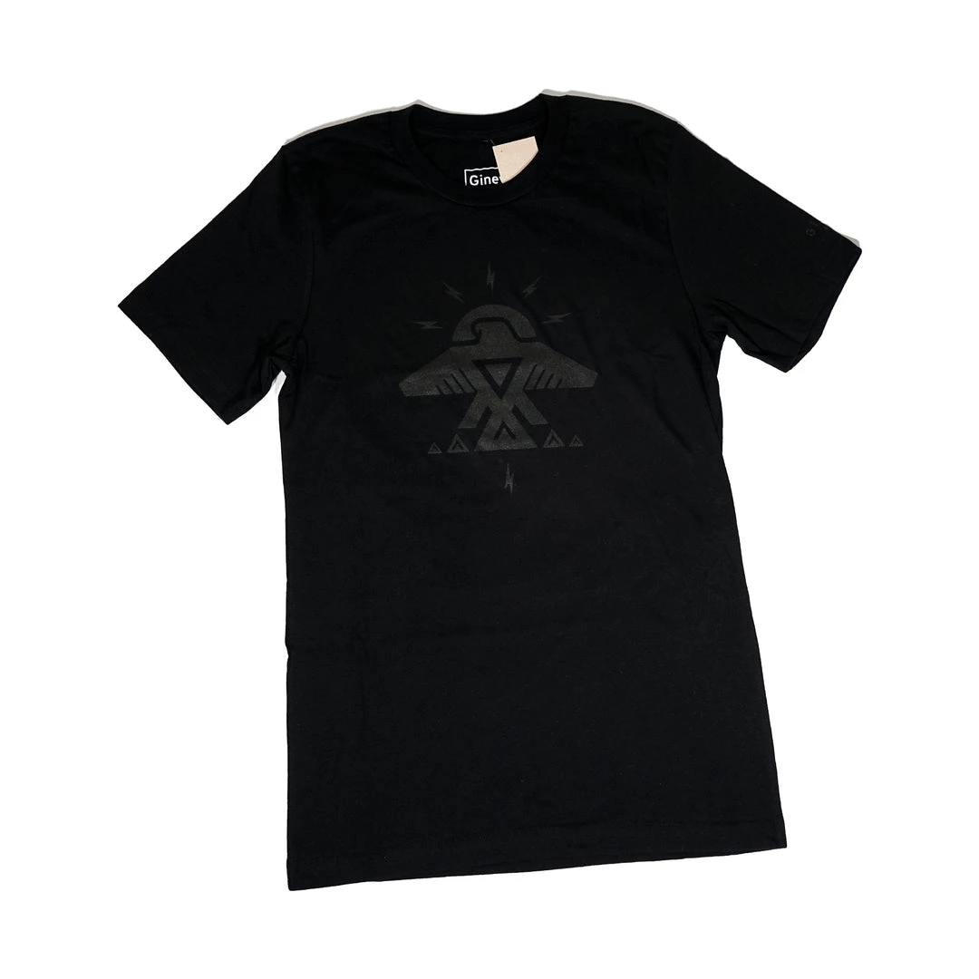 A super soft tee that features the Ojibwe Thunderbird with black-on-black design.