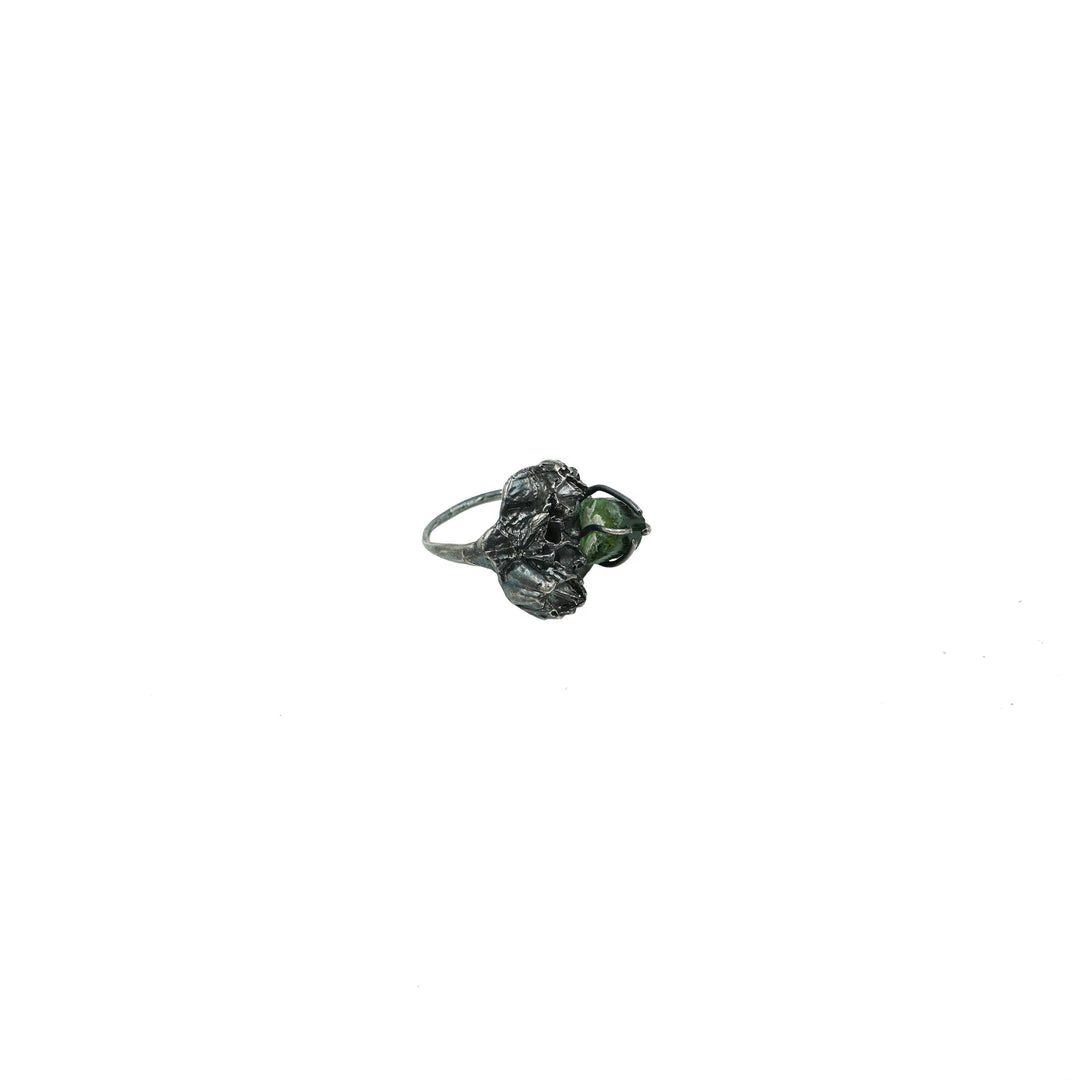 The Sea Goddess is a more delicate barnacle formation that cradles a rough cut green tourmaline gemstone on top of a delicate tapered shank. Made of oxidized sterling silver.