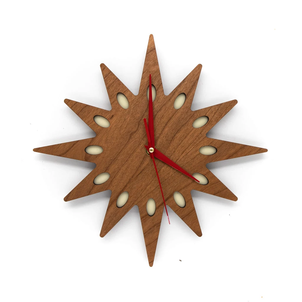 This Mod Starburst Clock is the perfect addition to your home, or for the perfect gift for those Mid-Century decor collector friends. Made from mahogany veneer, ivory acrylic background, with red hands by Incidental Design. Handcrafted in Portland, Oregon.