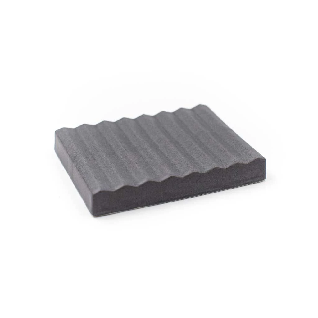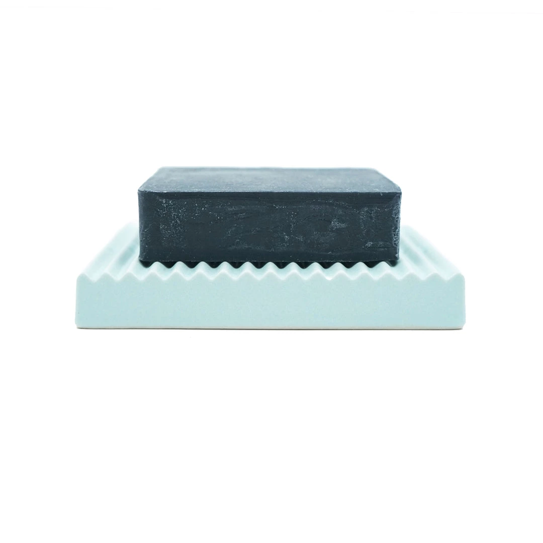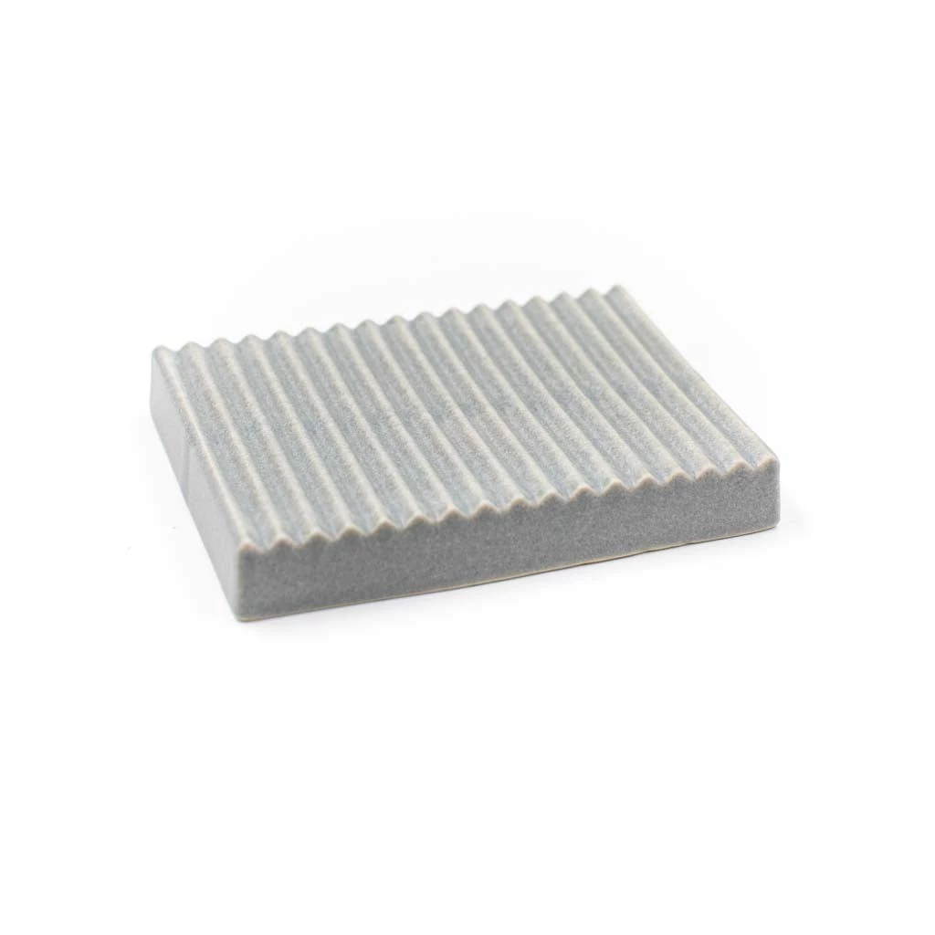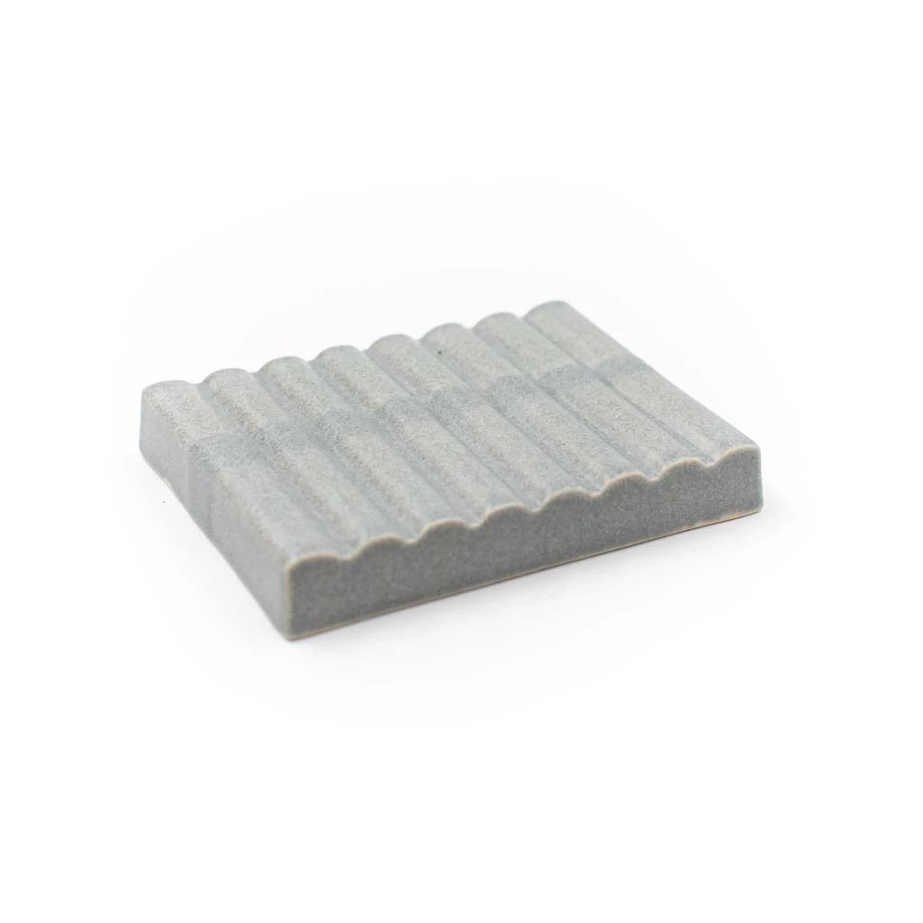 Slip cast porcelain ceramic bar soap holder with a smooth satin glaze. The bump and zig zag designs facilitate airflow to the underside of the soap.