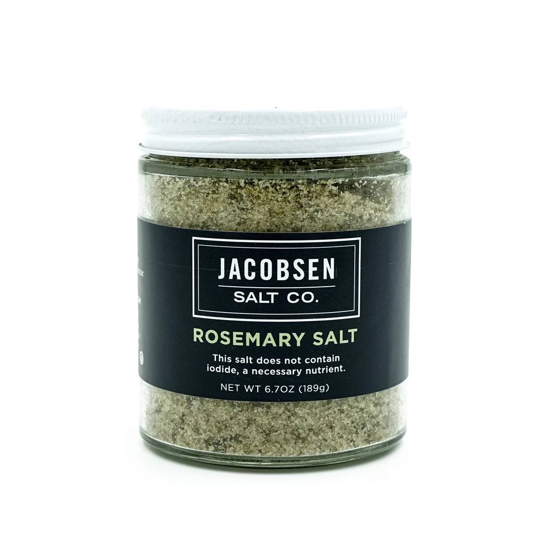 Fresh rosemary is de-stemmed and infused into Jacobsen hand-harvested sea salt, giving it a vibrant green color. Herbal and citrus notes, combined with hints of pine and tea leaf, pair perfectly with grilled or roasted lamb, stewed Tuscan kale, fried potatoes, or whole-wheat focaccia. Use this salt for cooking or as a finishing salt. 6.7oz jar.
