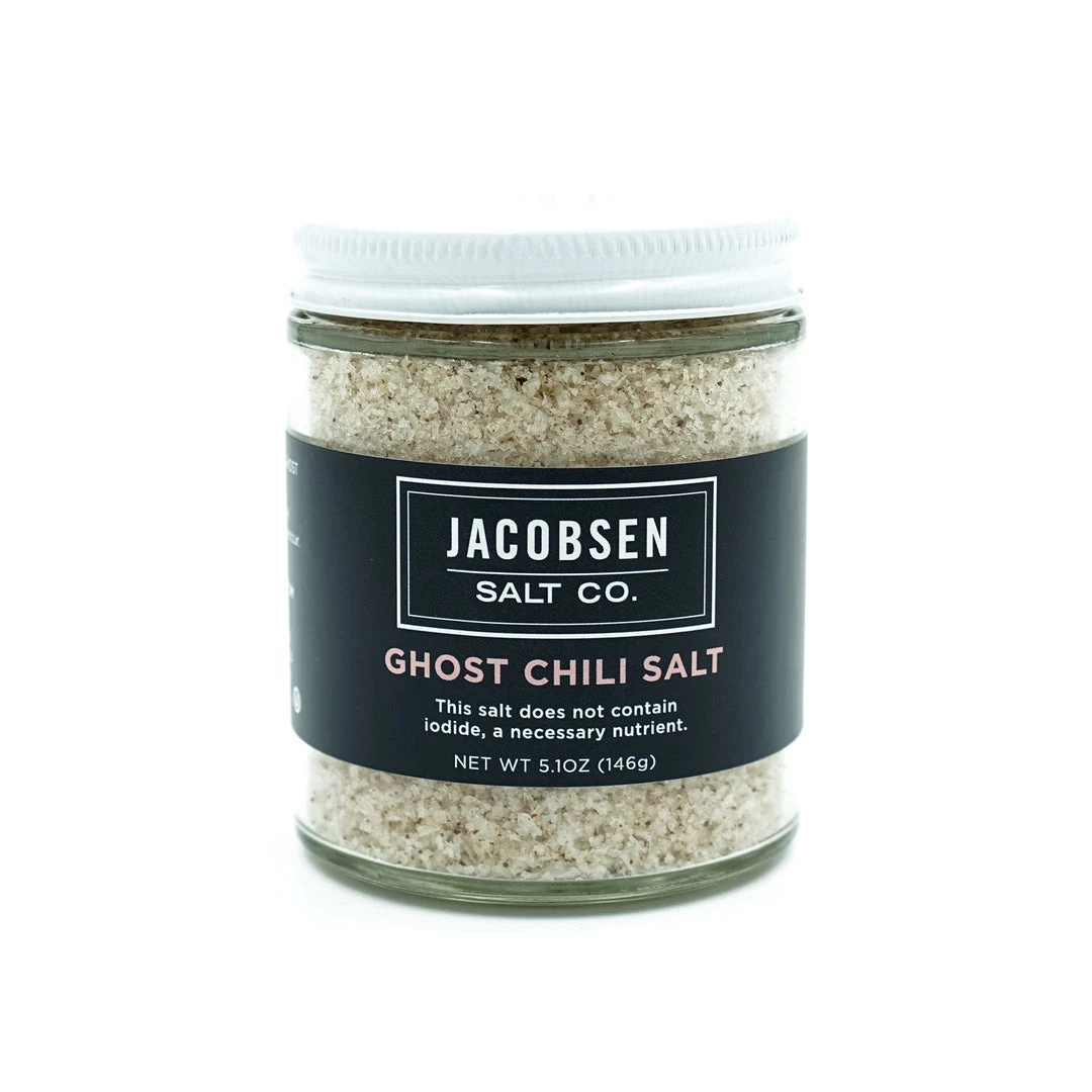 Ghost Chili salt adds a potent, pleasant, and lingering heat to brighten fried chicken, fresh grapefruit and red onion salsa, flank steak, or any citrus based cocktail. Use this salt for cooking or as a finishing salt. 5.1oz jar.