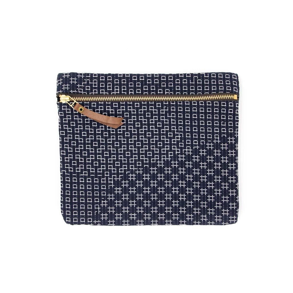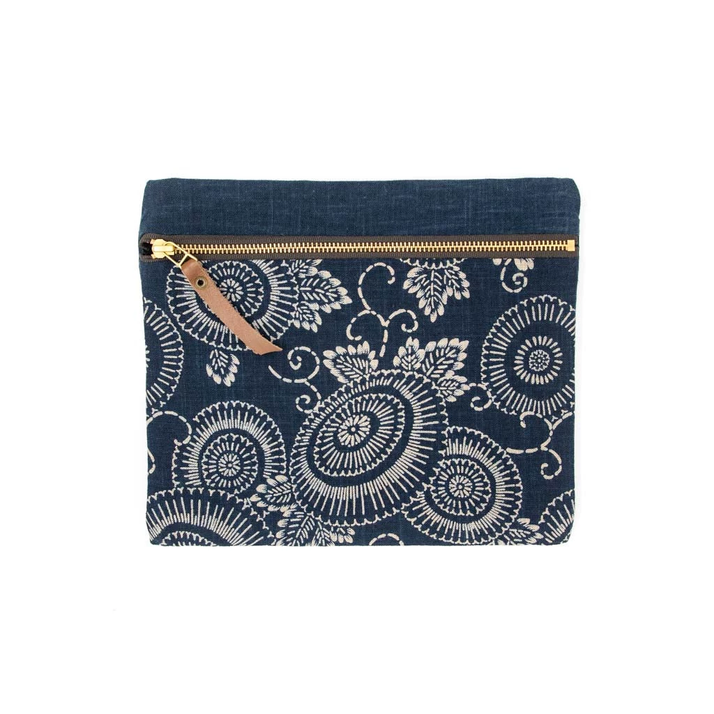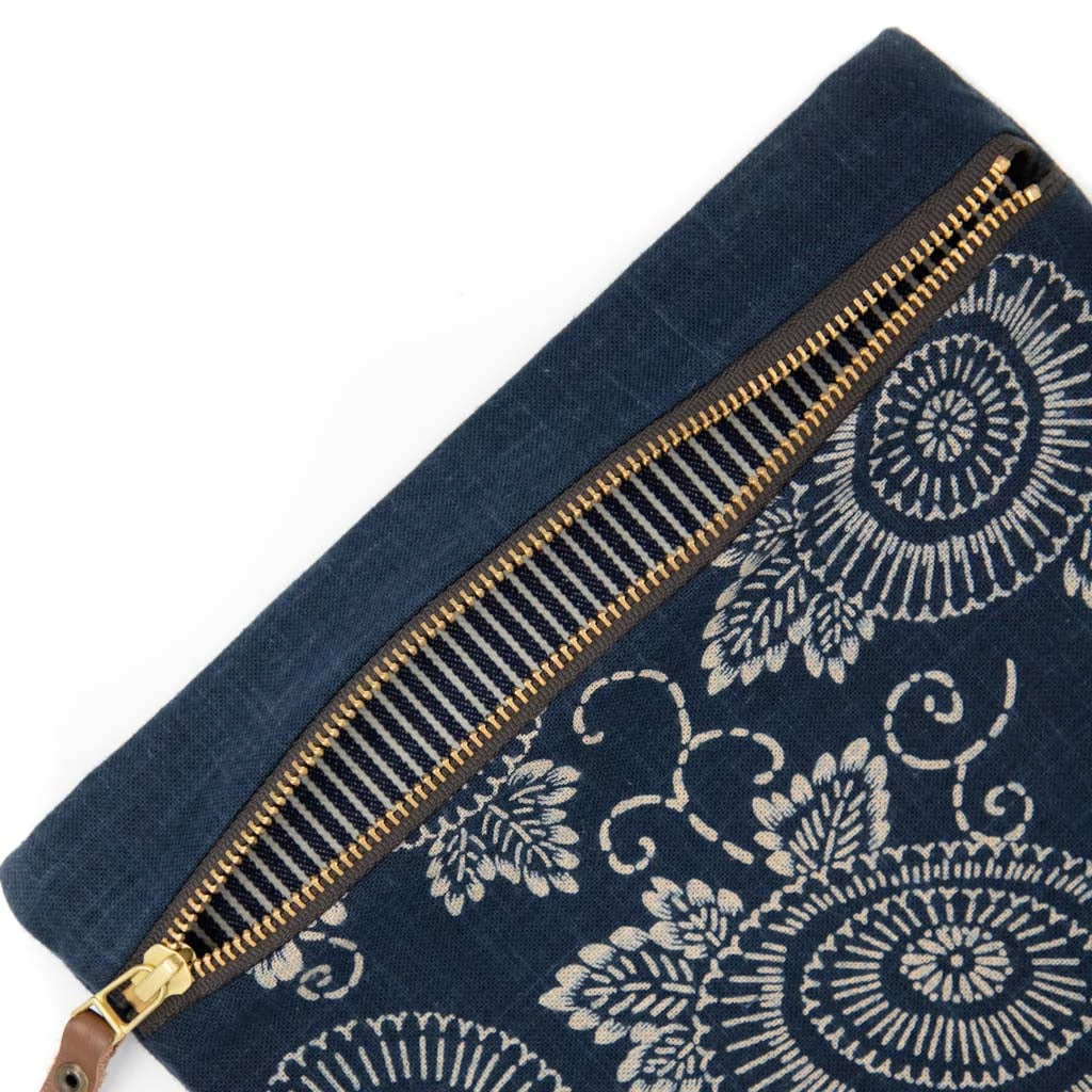 This particular zipper pouches are made with Sashiko Fabrics from Miwa Orimono, which is the only company in Japan that has kept this special jacquard machine from the 1940s. These machines are so intricate and old, one machine stitches only 1 meter of fabrics in an hour. These pouches were strengthened with stitches to reinforce points of wear.