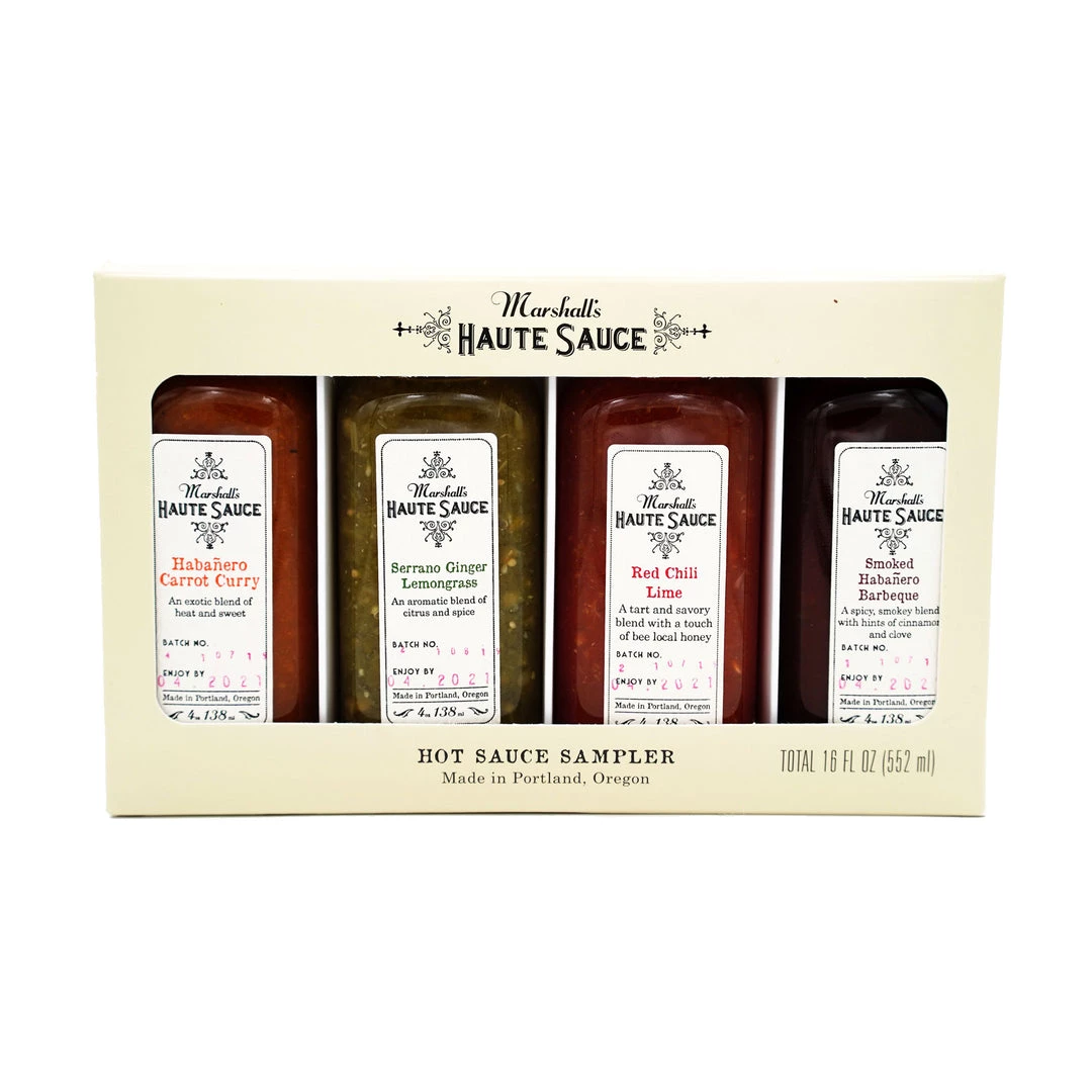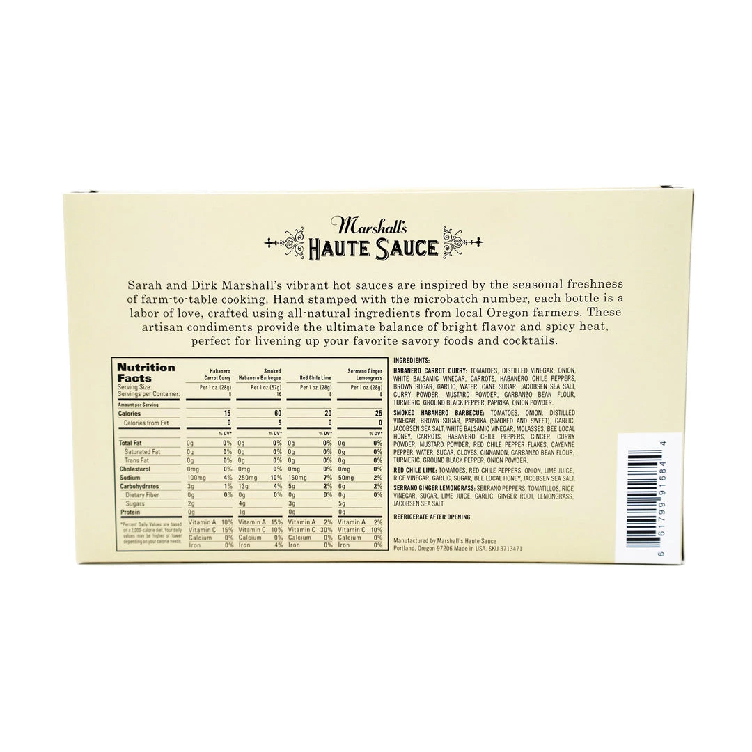 Sample pack includes a travel sized 4 oz bottle of Habanero Carrot Curry, Serrano Ginger Lemongrass, Red Chili Lime, and Smoked Habanero Barbeque – the perfect gift for your favorite haute sauce lover!