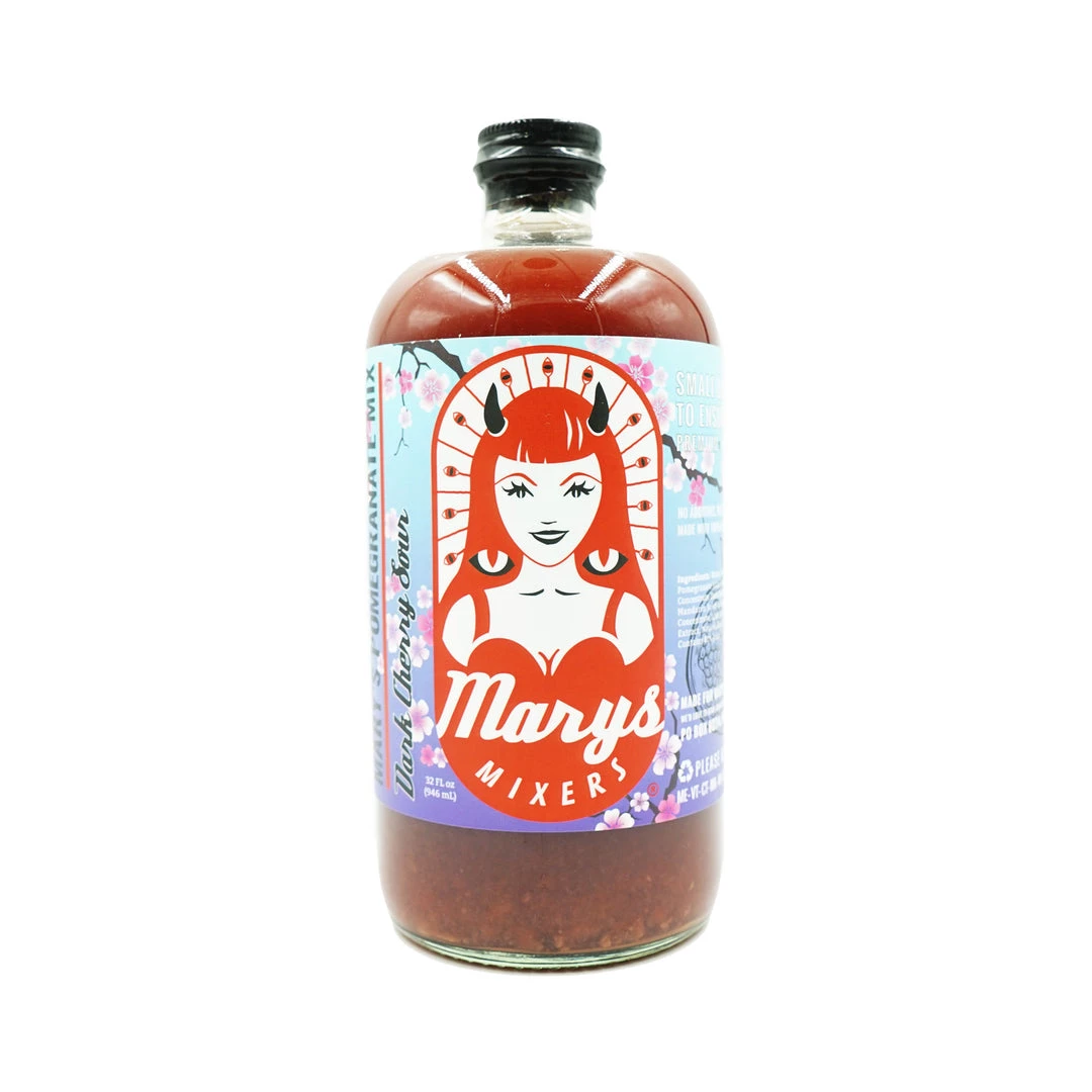 Blended Sour Mix with pomegranate, dark cherry with a touch of orange and cranberry. Mary’s Dark Cherry Pomegranate Mix is their most versatile mix, and pairs well with Tequila, Vodka, Gin, Rum, Champagne and more.