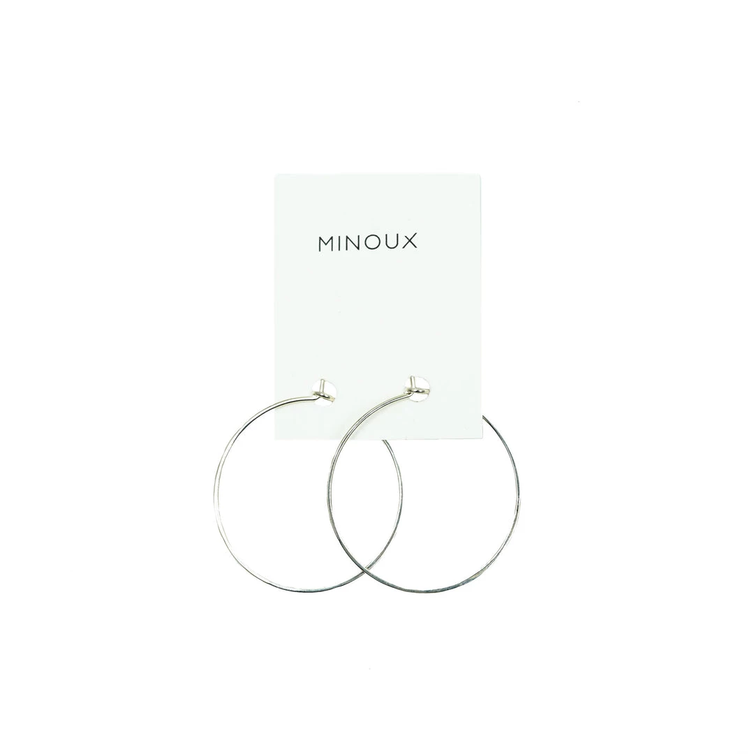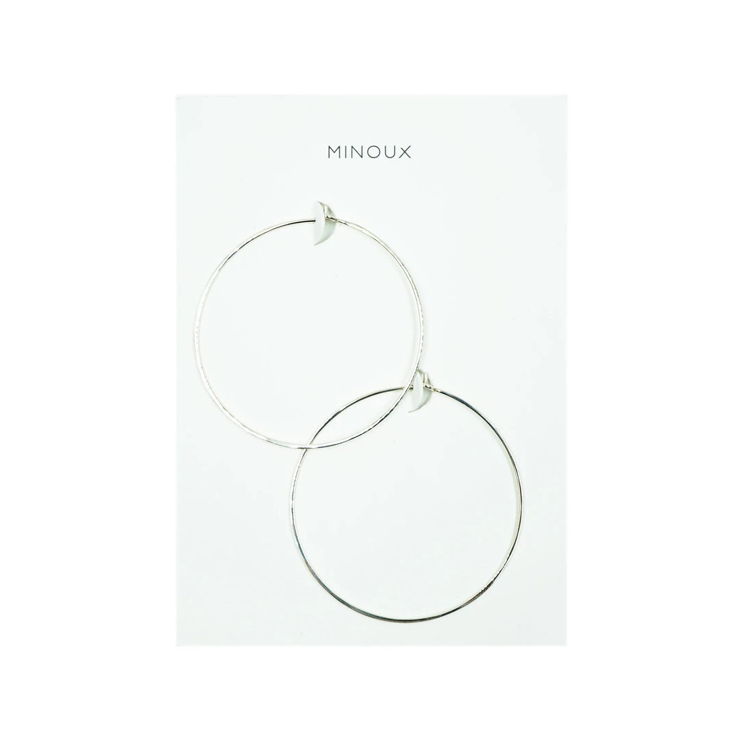 Delicate and classic sterling silver hoops. Available in 1.5″ or 2″ wide.