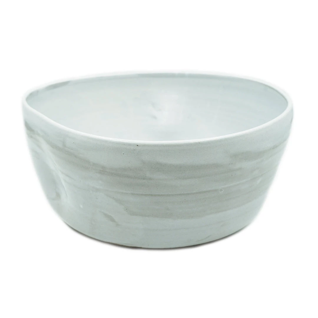 This serving bowl measures approximately 10″ wide x 6″ tall and is wheel-thrown with thumbprint indents on either side.