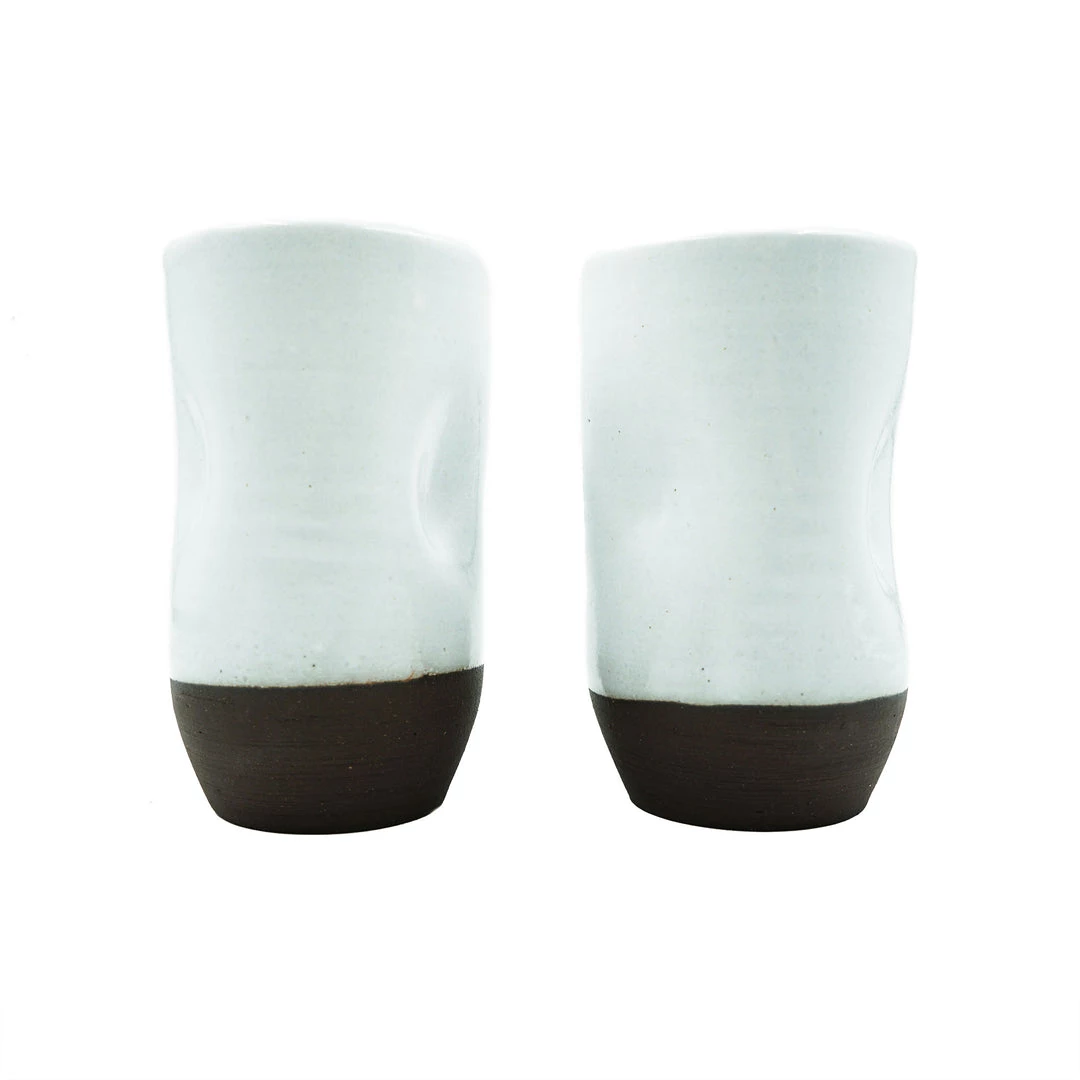 These tumblers are glazed in an opaque white satin glaze that highlights the contrast of the rich chocolate clay body.