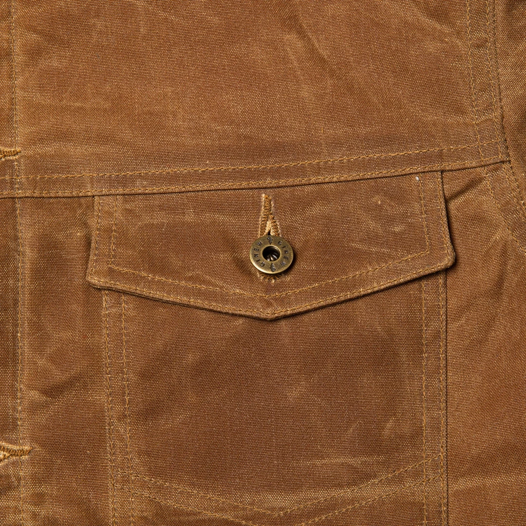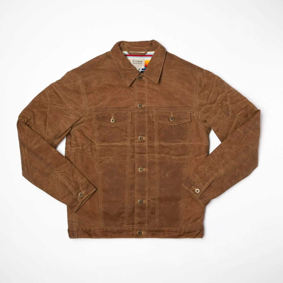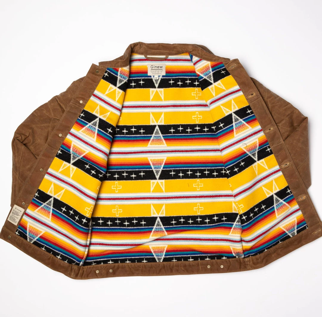The coat is made of 10.10 oz. Army Duck wax canvas, custom Ginew® blanket fabric by Pendelton®, custom quilted satin sleeve lining, custom Ginew® hardware, and features a modern fit. It features two front side pockets, two front chest pockets, and hidden embroidery under the collar. Each coat is sourced and constructed in the USA. Also available in Black.