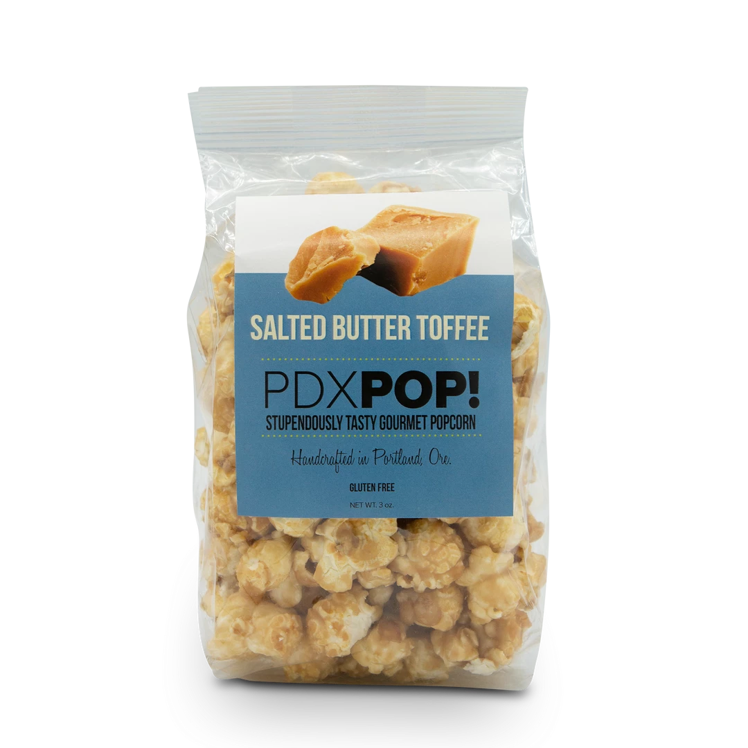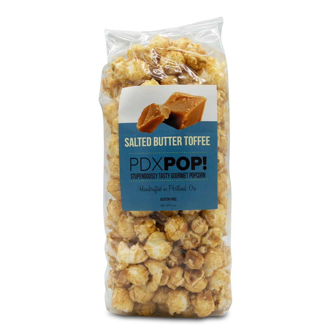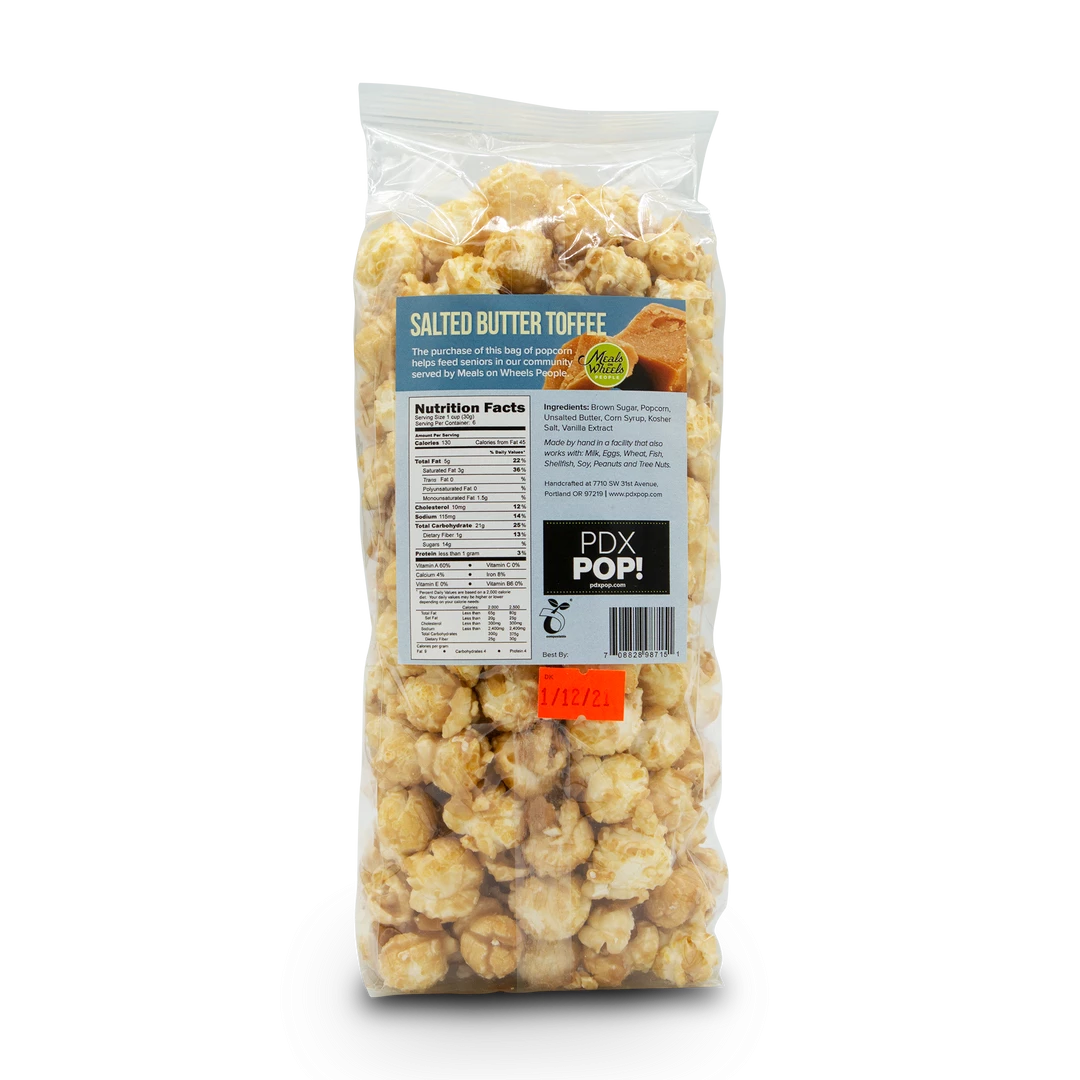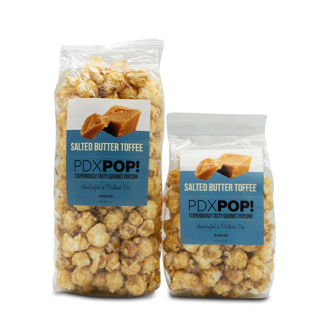 Salted Butter Toffee starts with fresh air-popped corn, then a sweet and rich hand-blended toffee sauce mixed and blended with a touch of kosher salt.