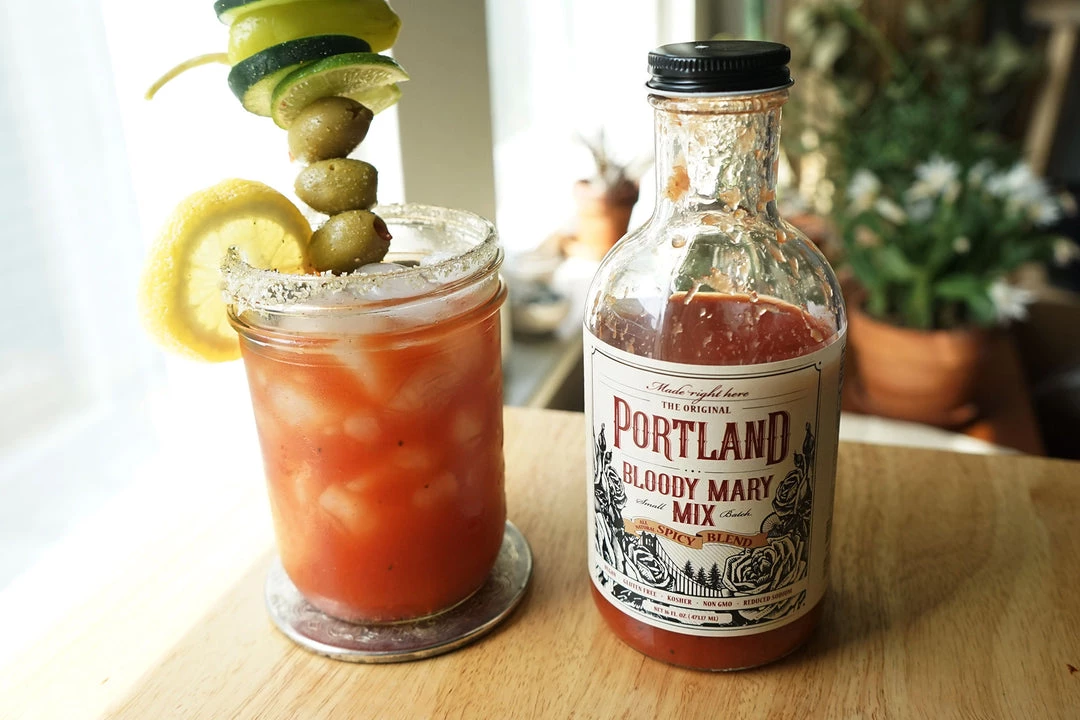 Portland Bloody Mary Mix is thicker than you usually see, because there’s nothing worse than a watery Bloody Mary. It tastes terrific with any kind of booze: vodka, of course, but also gin, tequila, beer, rum, bourbon, aquavit…you name it.  Spin it your own way.