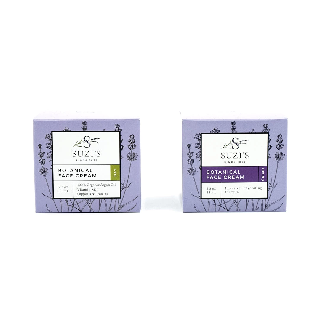 Day Cream: Deionized water, pure kosher vegetable glycerin, carthamus tinctorius (safflower) seed oil, stearic acid, glyceryl stearate, cetyl alcohol, coconut oil fatty acids, butyrospermum parkii (shea) fruit butter, tocopheryl acetate (vitamin E acetate), L – ascorbic acid (vitamin C), aloe barbadensis (aloe vera) leaf juice, calendula officinalis (marigold) flower extract, chamomilla recutita (chamomile) flower extract, *organic argania spinosa (argan oil), pursea americana, (avacado oil), symphytum officinale (comfrey) root extract, cucumis sativus (cucumber) fruit extract, xanthan gum, lavandula (lavender), sambucus nigra (phytocide elderberry), ethylhexylglycerine from coconuts.