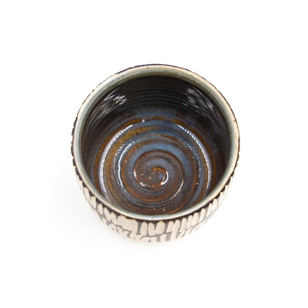 Hand-thrown porcelain stoneware ceramic cup with carved designs and a lifted foot.