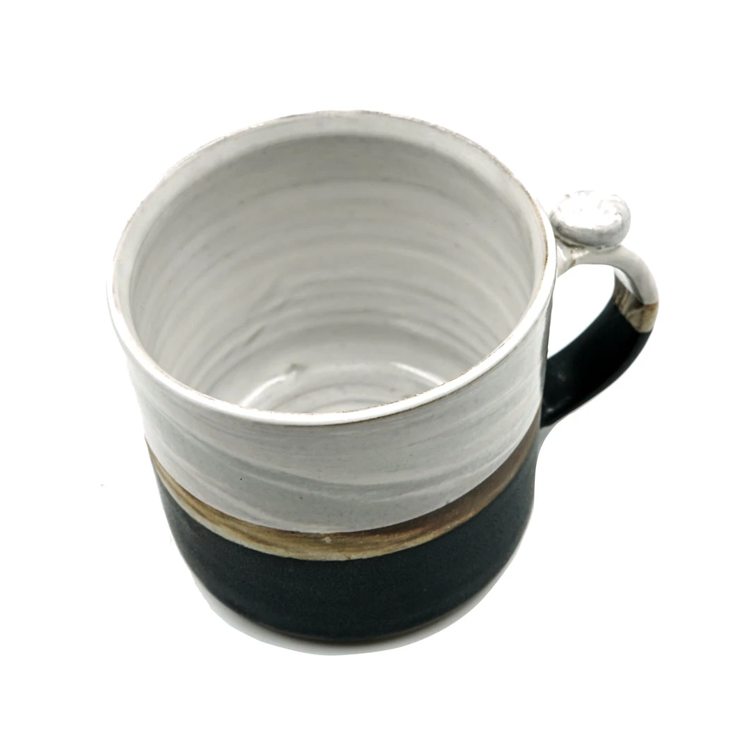 Hand-thrown ceramic marbled stoneware mug with half white and black satin glazes and a raw clay middle. Comfortable pulled handle and thumb rest. Holds at least 12oz.