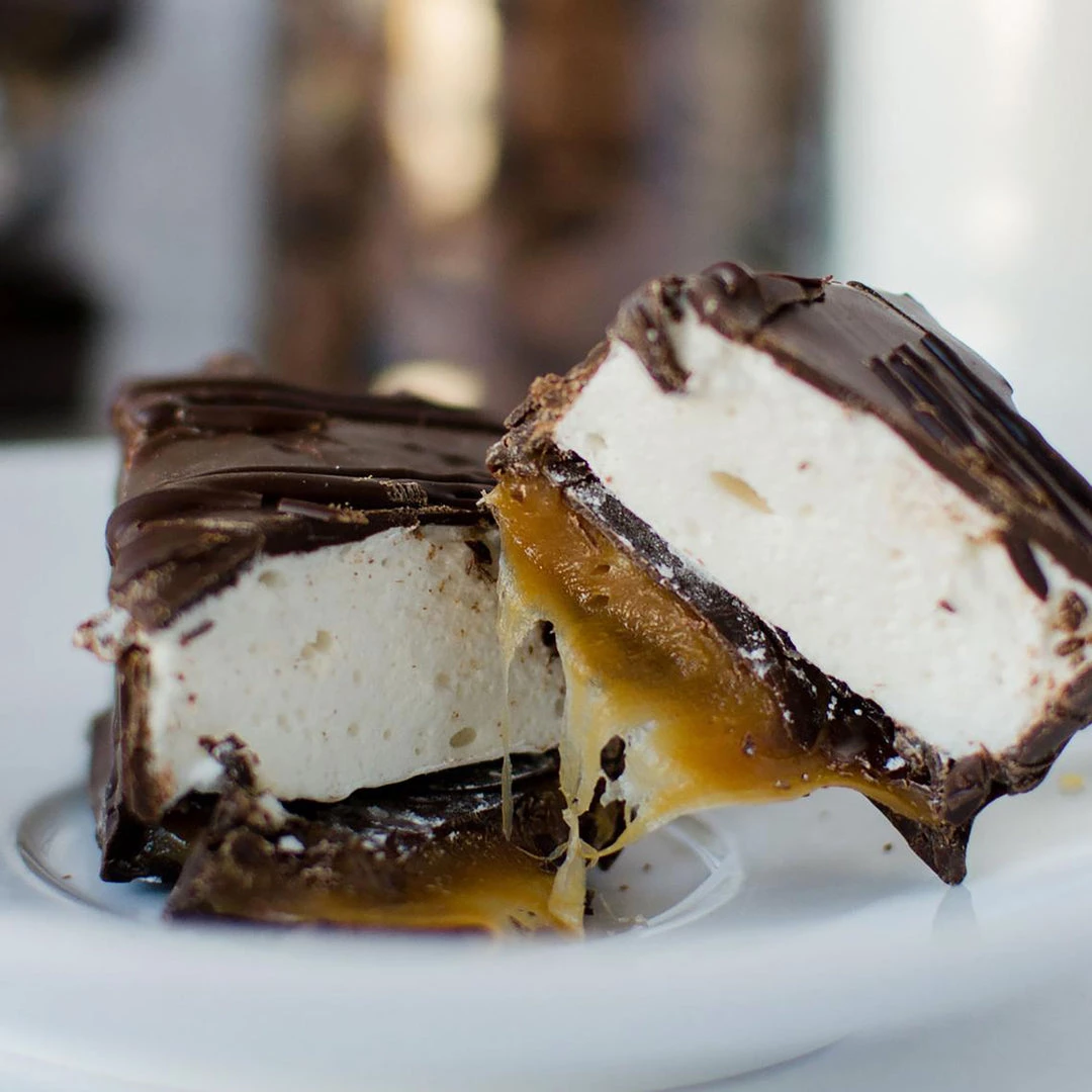 Handmade creamy caramel base with fluffy white handcrafted vanilla marshmallow floating on top then dunked in a chocolate bath.