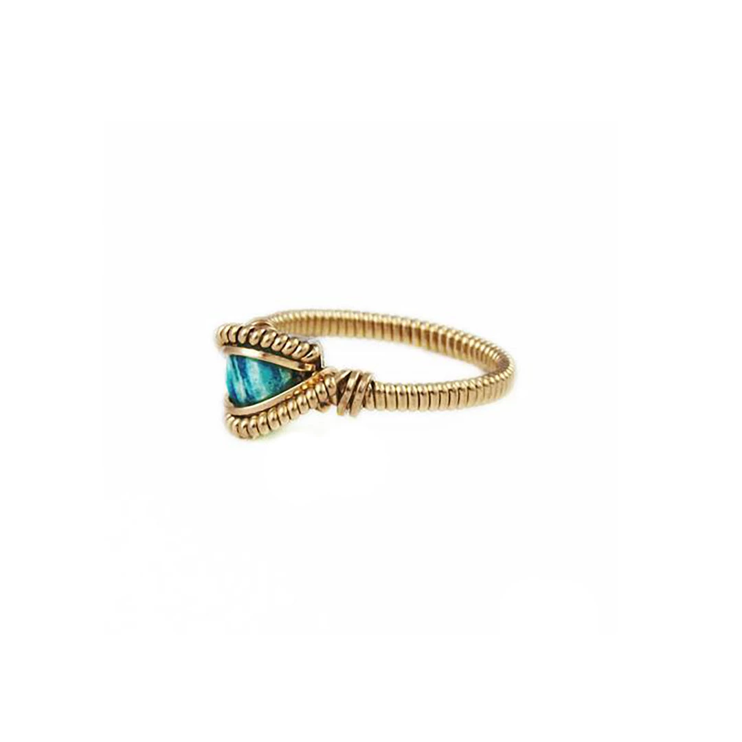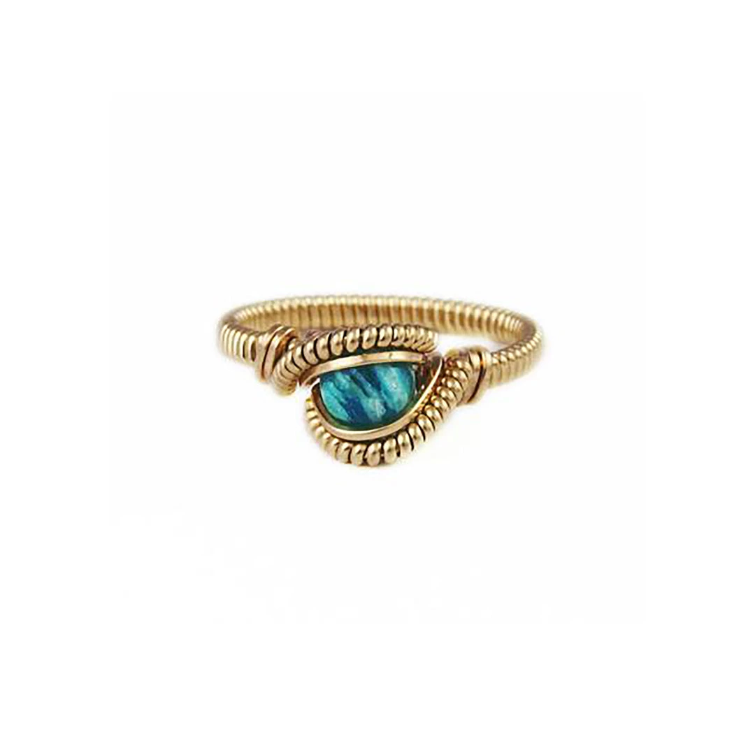 This piece is made with 14k Yellow Gold fill wires. It features a bright Amazonite cabochon as the centerpiece. Available in size 5 only.