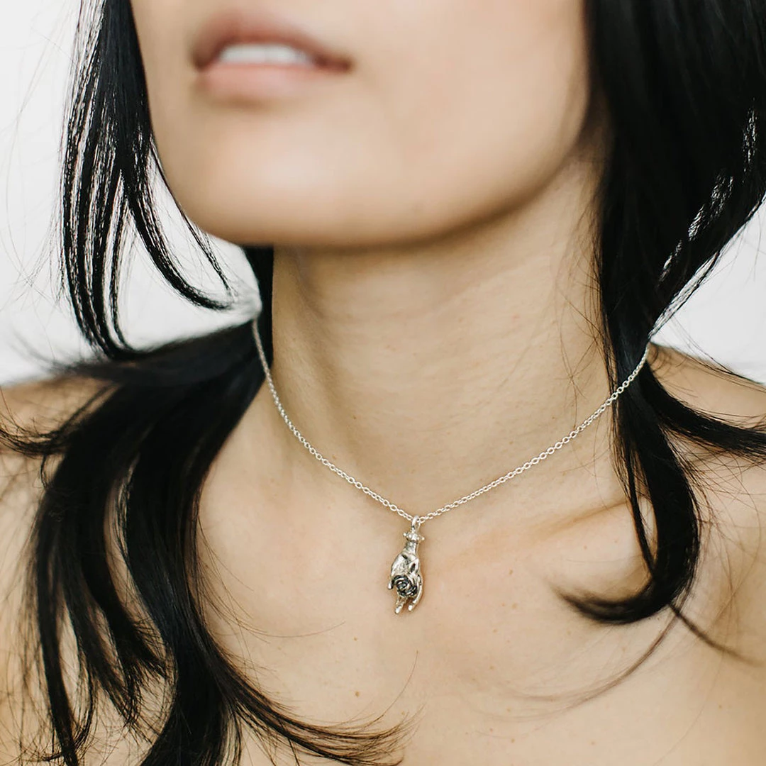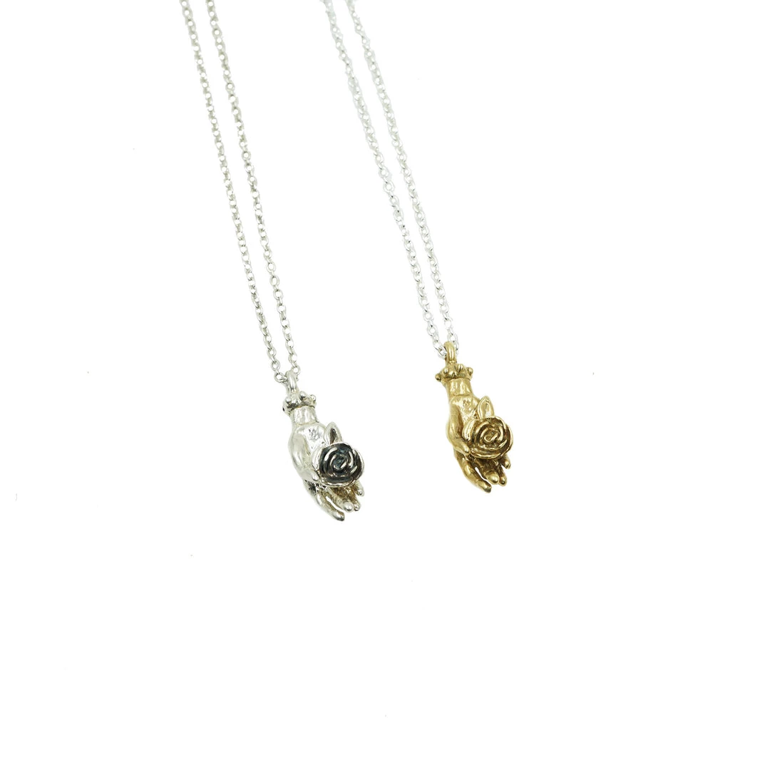 A delicate hand holding a rose hangs from an approx. 20″ sterling silver chain. Pendant formed in brass or silver.