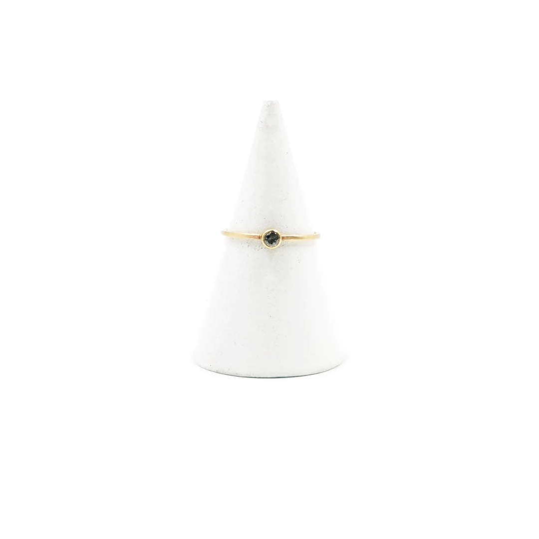 This understated, modern and elegant design features a 3mm Salt & Pepper diamond bezel set on a 1mm 14k gold band with a satin finish.