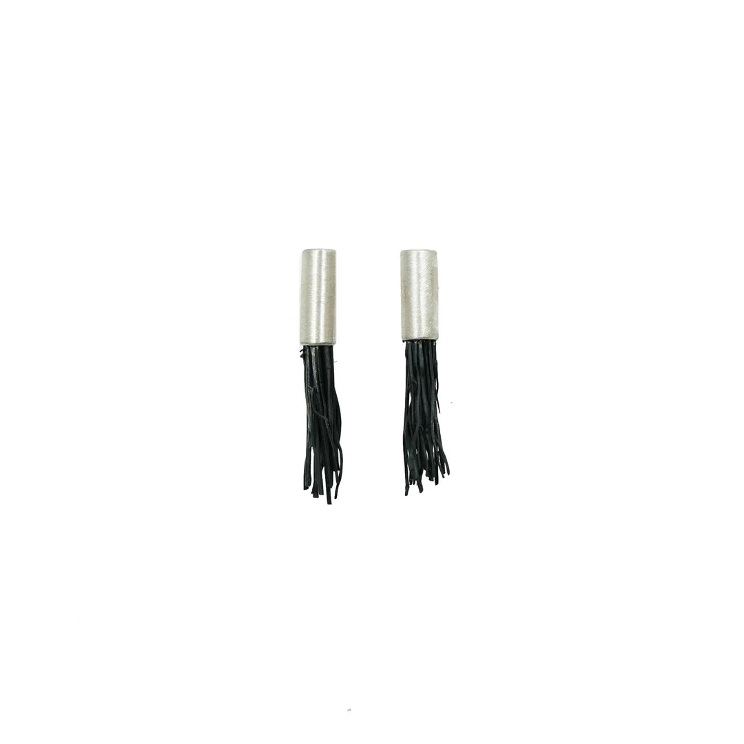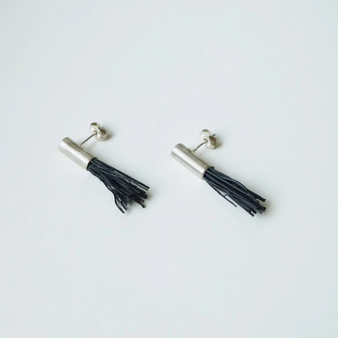These dramatic post style earrings feature black textured natural fiber paired with polished recycled silver.